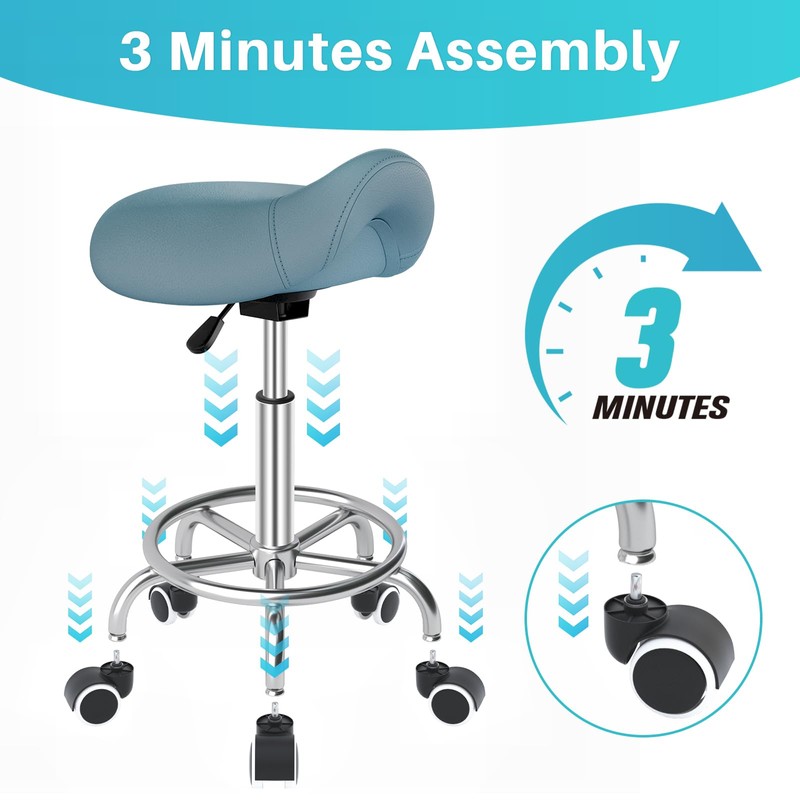 - 3 MINUTES DIY: Discard those tedious installation steps, assembling our saddle rolling stool is a breeze! The screws is already fastened on the cushion, so all you need to do is insert the wheels into the base, attach the air bar to the base, and finally insert the cushion into the air rod. It takes even less than 3 minutes