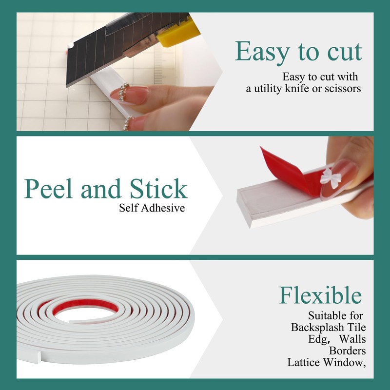 Use scenario: Rectangle Flexible Peel and Stick Trim Molding Trim is suitable for backsplash tiles, edges, walls, borders, latticework, flexible self-adhesive wall trim, effectively covering edge cracks and stains, keep clean and tidy.