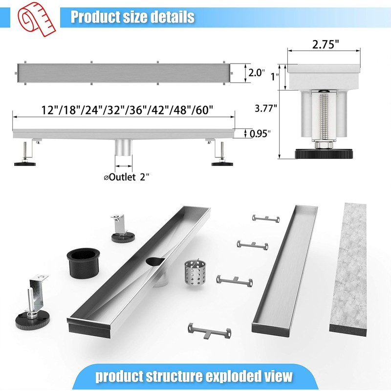 - V-Shaped Large Flow Drain: Size of linear shower drain is 42 inches long, 2.75 inches wide, and has a 2-inch drain opening. With a "V" shaped channel flow rate can reach 50-60L/min. Shower drains effectively prevent waterlogging and provide a dry, odor-free bathroom.