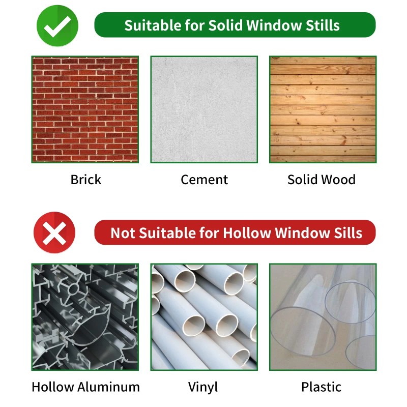 INSTALLATION TIPS: The window ac bracket should be installed with a slight tilt down for condensate draining purpose, fits wall thickness from 2'' to 11'' with cement, wood and brick sills, no suitable for hollow aluminium,vinyl and plastic sills, casement windows