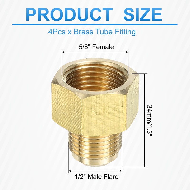 - PACKAGE SPEC - Color: Gold; Material: Brass; Thread Size: 1/2 inch Male Flare x 5/8 inch Female; Packing List: 2Pcs x Brass Tube Fitting