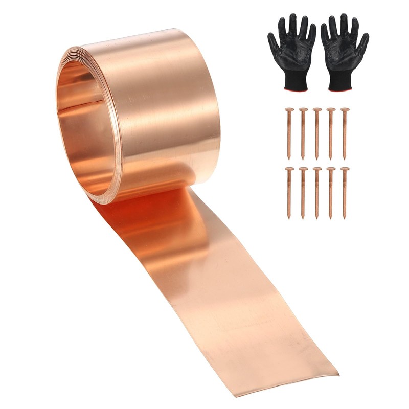 - PACKAGE SPEC: Material: Copper Sheet Roll Size: 0.5 x 60 / 0.02 x 2.36 Inch (T x W); Length: 3 m / 10 Ft; Packing List: 1 Pcs x Copper Sheet Roll, 1 Pcs x Black Thickened Nitrile Glove (L size, 43g), 10 Pcs x Copper Nails (38mm/1.5 inch)