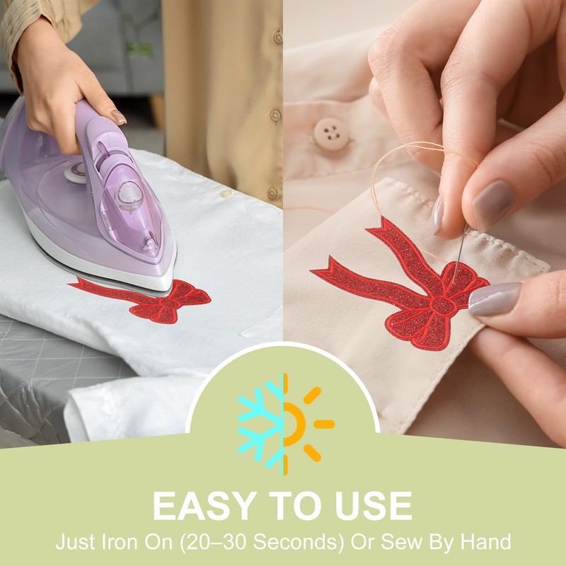 - MULTI APPLICATION - Apply these iron-on bow patches to clothing like jackets, jeans and T-shirts, accessories including bags and hats, home decor such as pillows and curtains, or use them to cover fabric imperfections and wear marks.