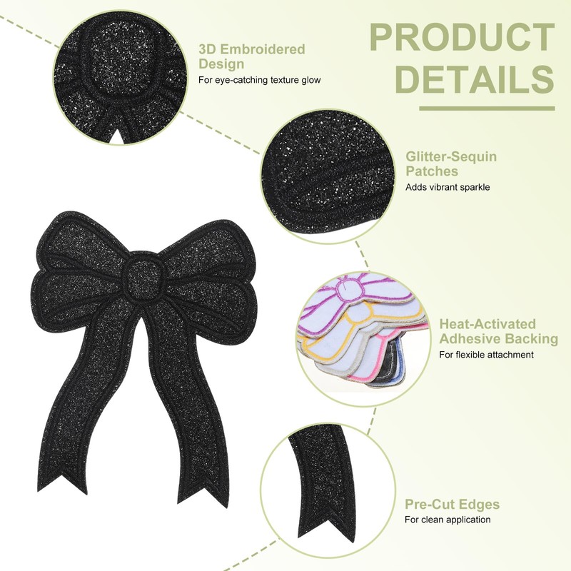 - KEY POINTS - These sparkly sew on bows feature a 3D embroidered design for eye-catching texture, pre-cut edges for clean application, and a dual adhesive-sew option for flexible attachment. The glitter-sequin detailing adds vibrant sparkle while maintaining wash-resistant durability.