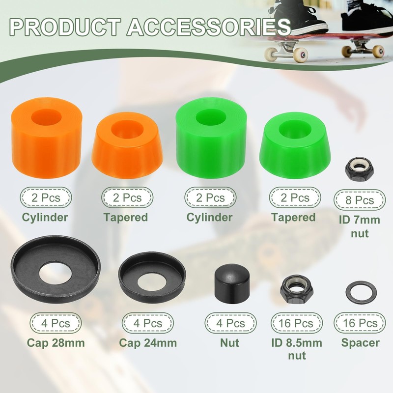 - Size: Color: Green/Orange; Material: PU; Cylinder Size: 10 x 24 mm / 0.39 x 0.94 inch (IDxOD); Cylinder Height: 16 mm / 0.63 inch; Tapered Size: 10 x 11 mm / 0.39 x 0.43 inch (IDxH); 19 x 24 mm / 0.75 x 0.94 inch (OD); Package Content: 2 Pack x Skateboard Bushing Set; Accessories: ID 8.5mm nut*2, ID 7mm nut*4, cap 28mm*2, cap 24mm*2, nut*2, spacer*8