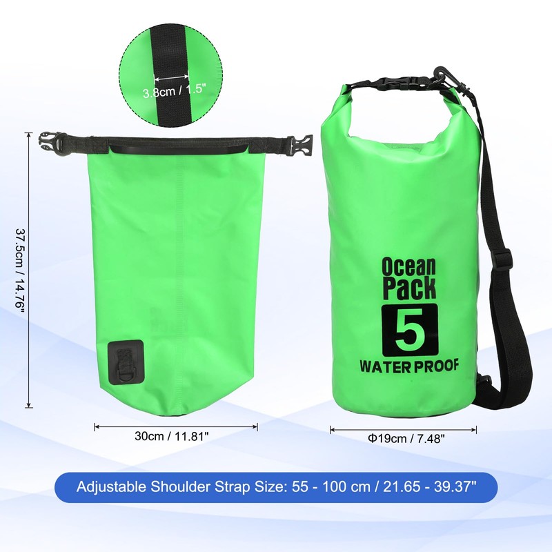 - PARCEL CONTENT- Color: Green; Material: PVC; Size: 5 L; Flat Size: 37.5 x 30 cm / 14.76 x 11.81 inch (L*W); Bottom Diameter: 19 cm / 7.48 inch; Shoulder Strap Width: 3.8 cm / 1.5 inch; Adjustable Shoulder Strap Size: 55 - 100 cm / 21.65 - 39.37 inch; Packing List: 1 Pack x Dry Bag Waterproof