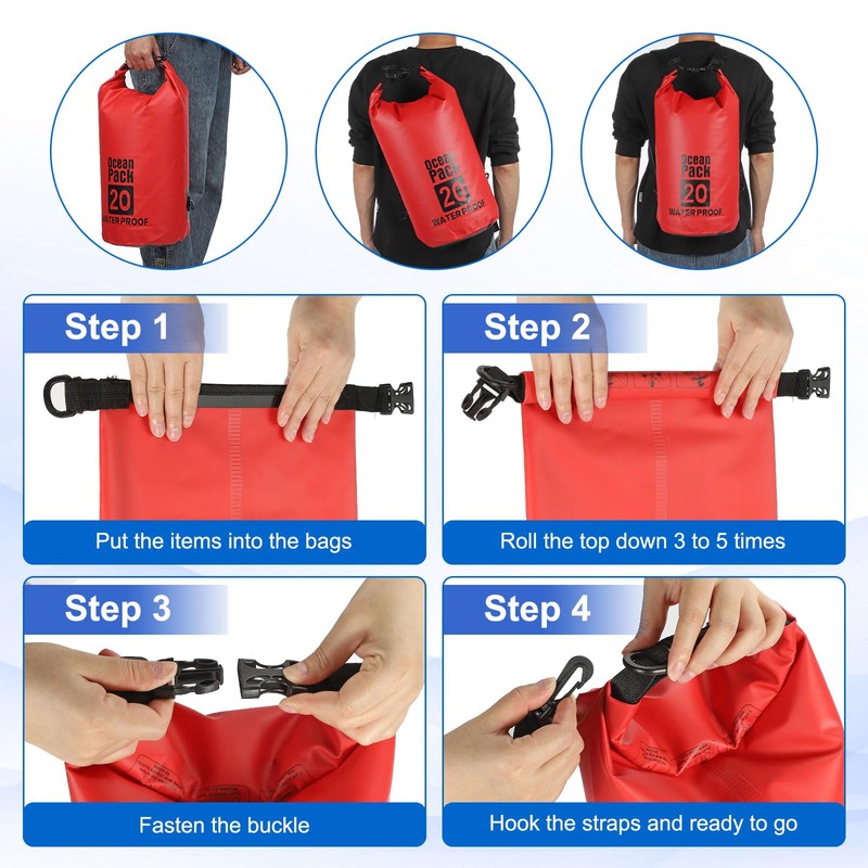 - KEY POINTS- Each bag comes with a free whistle, bringing comprehensive protection for your safe travel. Outdoor Bags also come with an adjustable shoulder strap very convenient for your on-the-go. The lightweight dry bag will not weigh down your arms or shoulders.