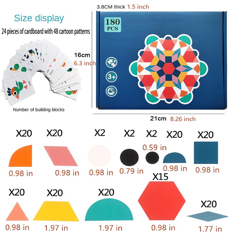 - 【Stimulate the imagination】-Children can try to figure out which puzzle pieces make up the patterns on the cards and use these pieces to create different animals, insects, birds, and more. These pattern blocks also effectively train children's imagination, hand-eye coordination, and color and shape recognition skills.