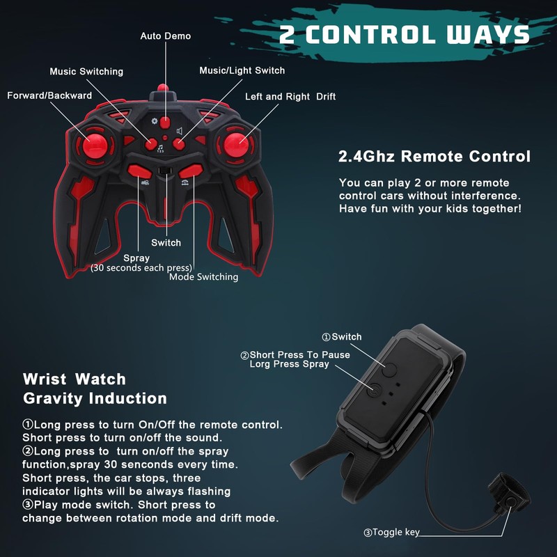 - 【Intelligenter Fernbedienungsmodus】 Die Fernbedienung nimmt 2.4ghz Übertragungstechnologie, die empfindlich auf die Kontrolle und keine Interferenz mit einander ist. Und noch eine erstaunliche Fernbedienung Uhr. Tragen Sie die Uhr an der Hand, ändern Sie Ihre Körperhaltung, und das glove controlled car kann Ihre Haltungsänderungen wahrnehmen, fahren und nach Belieben ändern.
