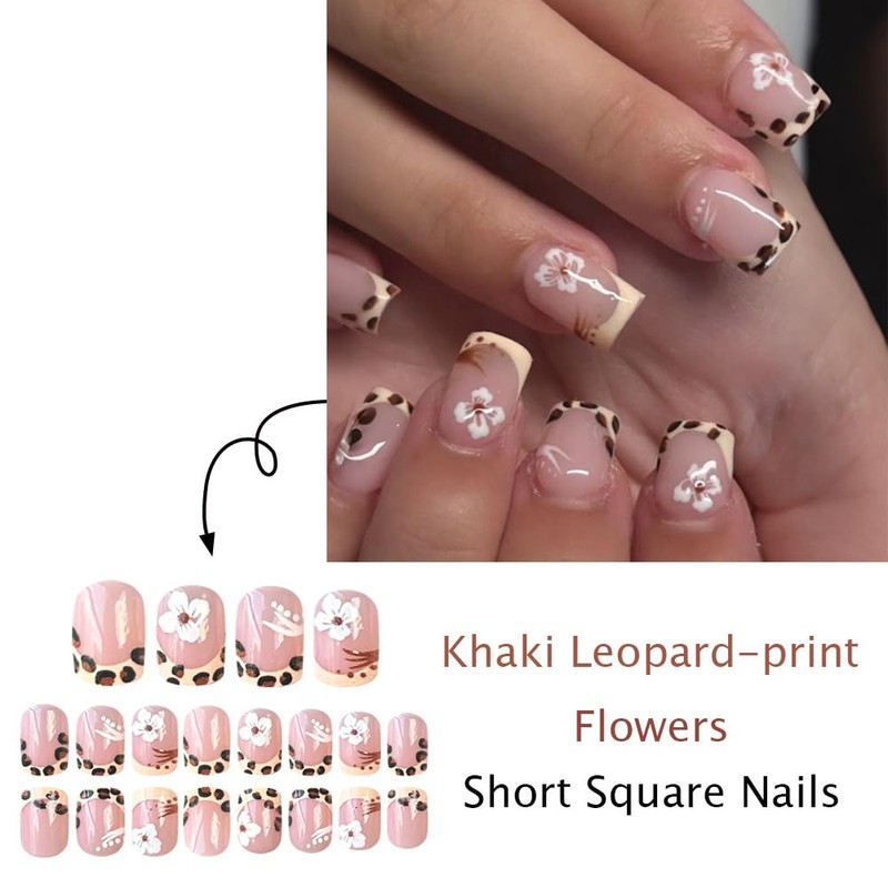 Yellow French French Tip Press on nails Leopard Print Fake Nails Short Square False Nails with Flower Design Leopard Print Glue on Nails Artificial Full Cover Stick on Nails for Women Manicure 24 Pcs