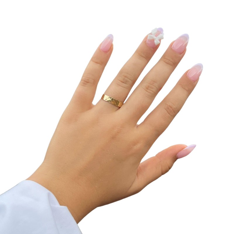 Yellow gold-filled ring is made from flat wire and offers a hammered, bright finish.