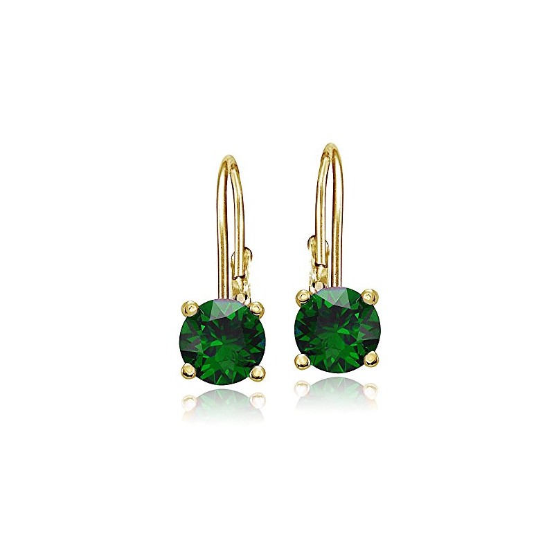 - Drop earrings feature created round-cut emerald gemstones set in yellow gold flashed .925 sterling silver.