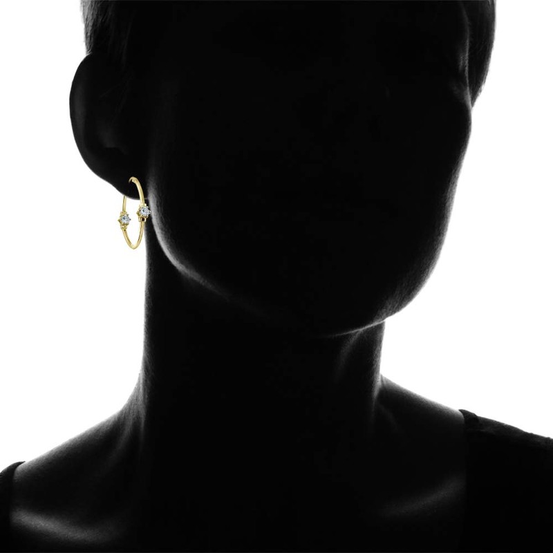 - These stunning earrings are perfect for both simple daytime use and luxurious evening wear. These unique hoop earrings feature two round-cut cubic zirconia stones in a polished oval hoop settings. These earrings are secured by post with snap-down backs. These earrings are crafted of yellow gold flashed 925 sterling silver and are nickel free.