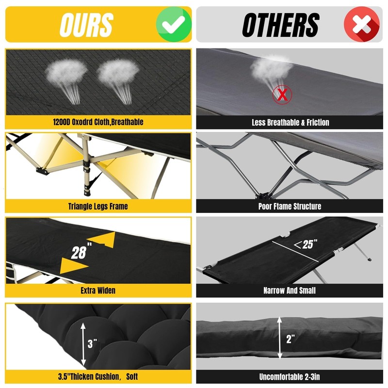 - Breathable 1200d Material And Removable MattressCamping Cot is made of dual-sided 1200D oxford skin-friendly and comfortable fabric with 3" thick and high-quality cotton filling.More breathable and soft than others,also easy to clean.You won't feel any pain lying on it,bring you comfortable night or outdoor sleep.Beides,mattress can be removable,so you can use cot in summer,suitable for all seasons