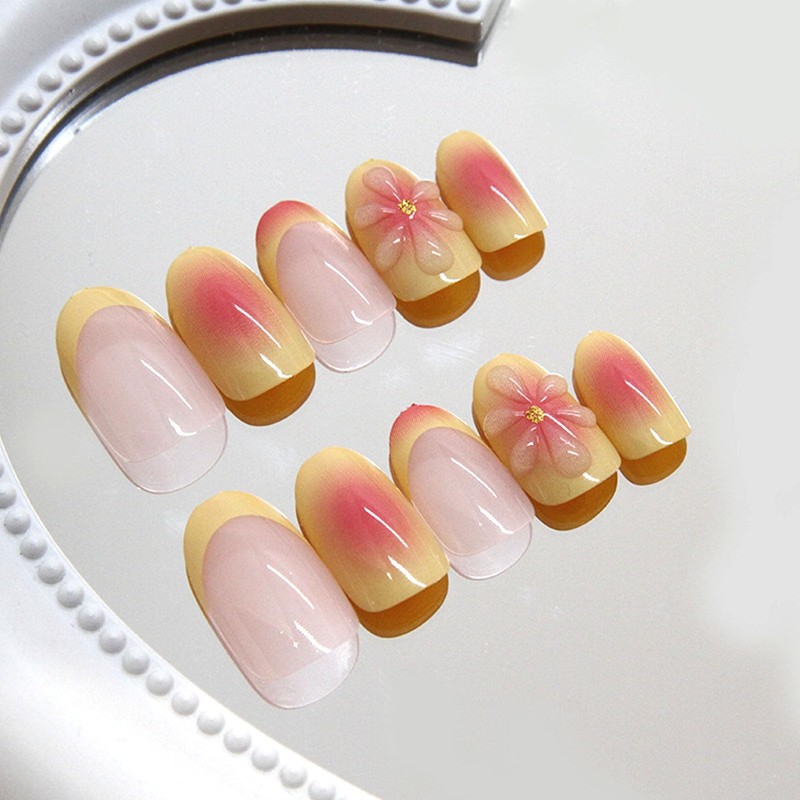 Yellow Press on Nails Round Short False Nails Spring French Tip Nails Press ons with 5D Flower Red Blooming Designs Light Pink Transparent Glue on Nails Oval Glossy Fake Nails for Girls 24Pcs