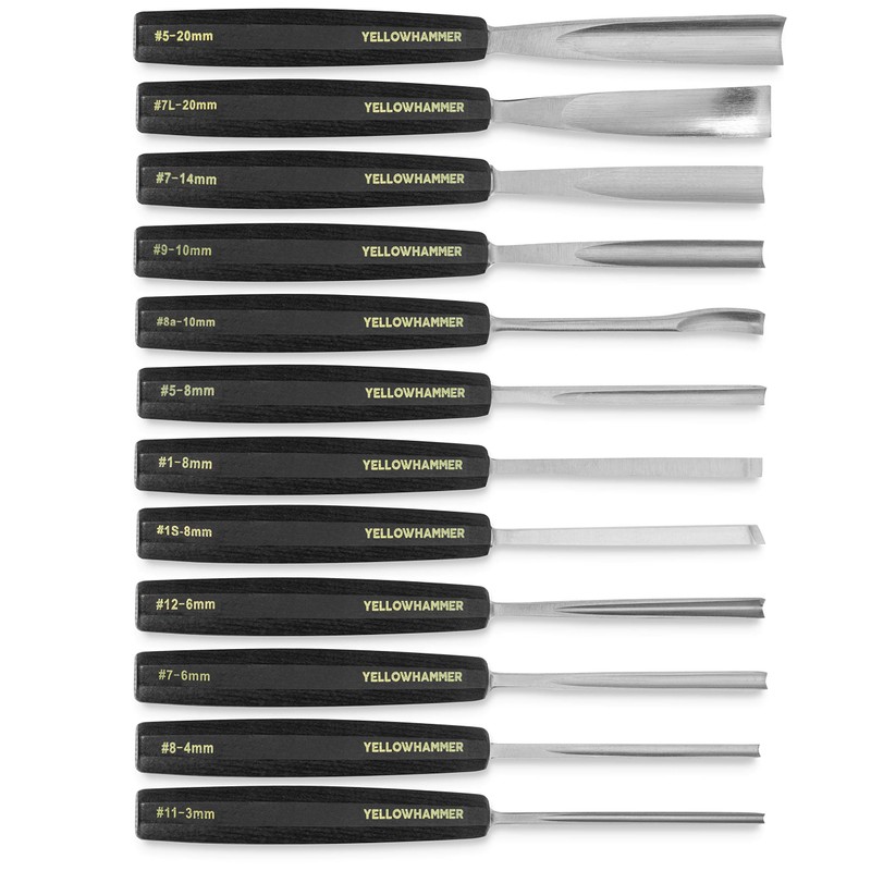- WHAT’S INCLUDED: #5 Gouge 20mm, #7 Heavy Bent Gouge 20mm, #7 Gouge 14mm, #9 Gouge 10mm, #8 Spoon Gouge 10mm, #5 Gouge 8mm, #1 Straight Chisel 8mm, #1 Skew Chisel 8mm, #12 V Parting Tool 6mm, #7 Gouge 6mm, #8 Gouge 4mm, #11 Veiner 3mm.
