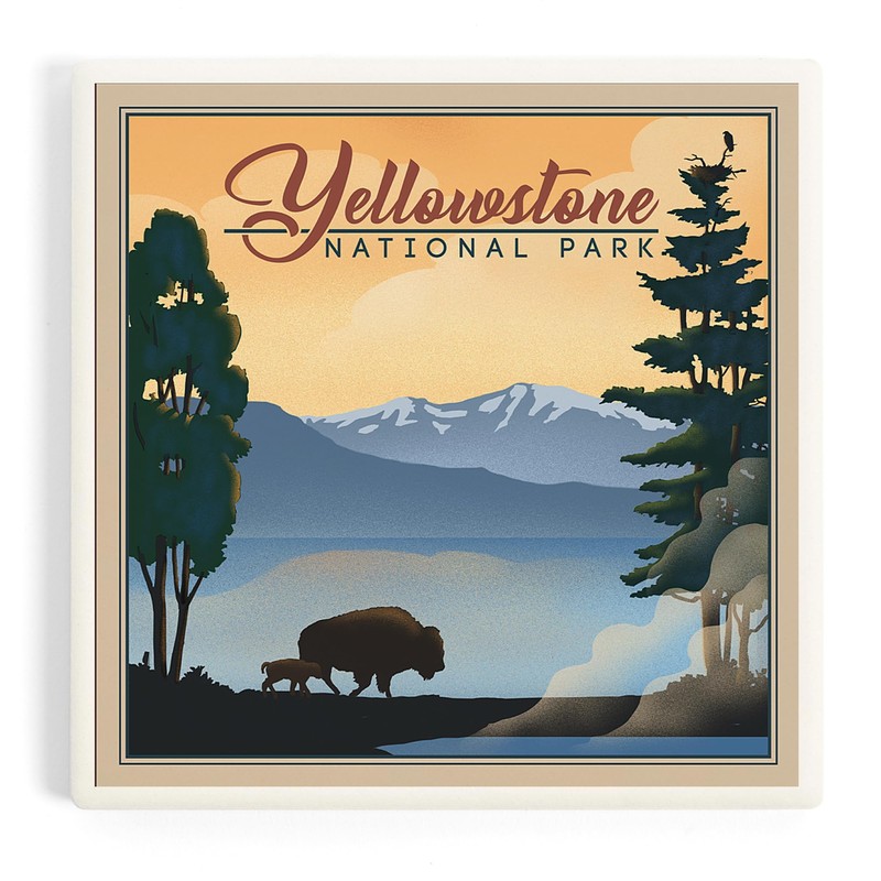 - Yellowstone National Park, Bison and Lake, Lithograph National Park Series (Absorbent Ceramic Coaster, Single, Cork Back, Kitchen Table Decor)