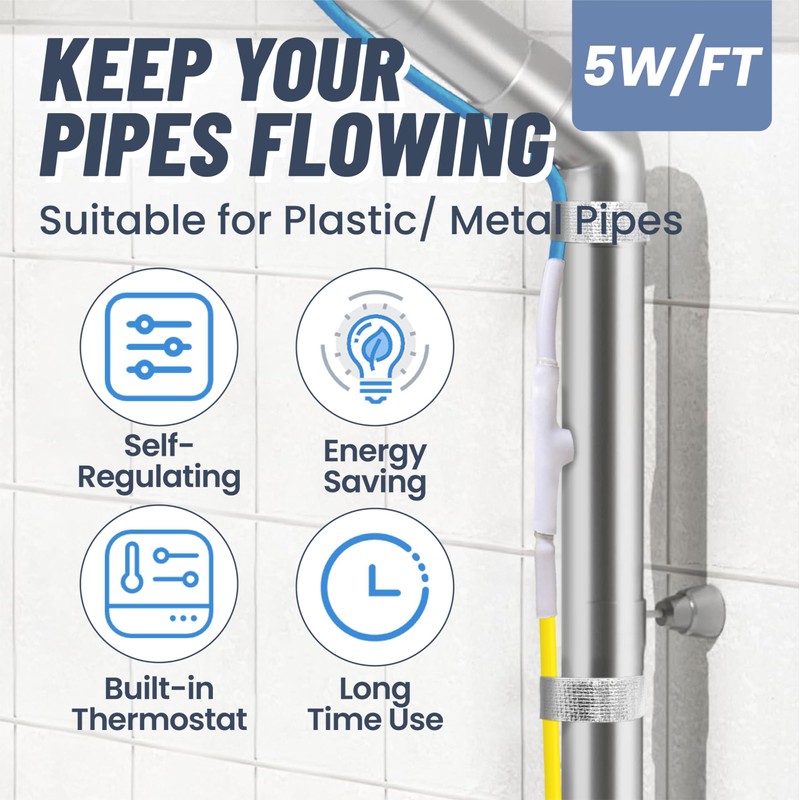 - Precise Temperature Control: Self-regulating water pipe heat cable uses advanced self-regulating technology to automatically adjust heat output based on ambient temperature, with 5 watts per foot at 50°C (10°F) and 8 watts per foot at 32°F (0°C). The built-in thermostat saves energy by turning on at 37°C (3°F) and turning off at 50°C (10°F), powering the heat tracing cable only when necessary