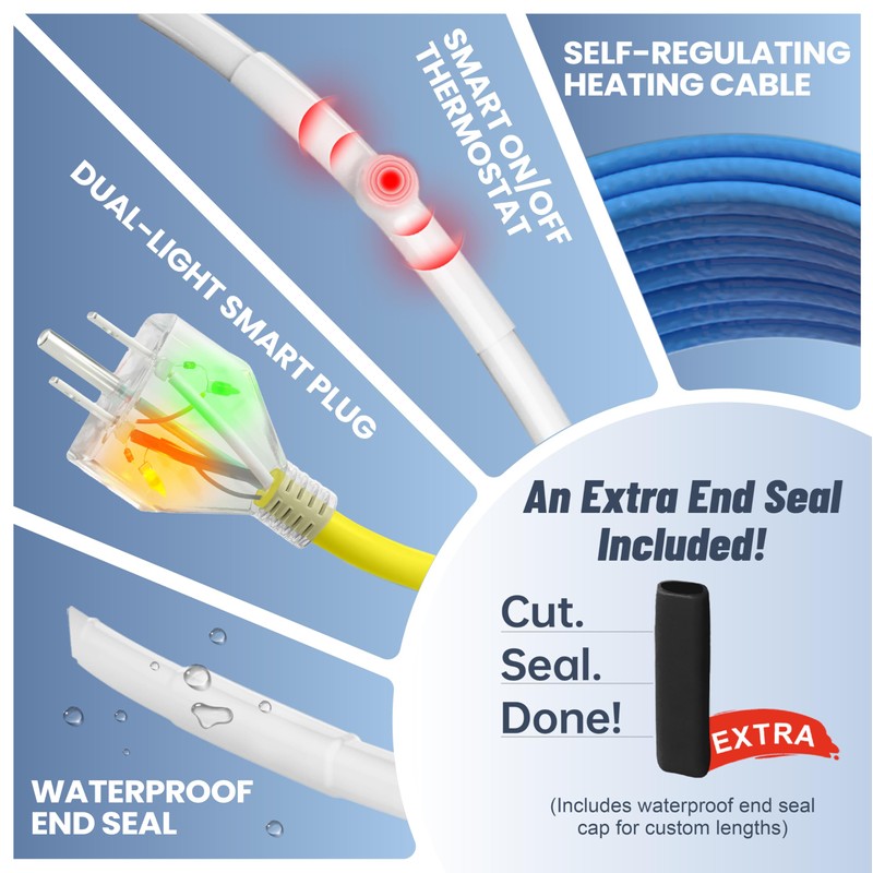- Upgraded Dual-Indicators: Our pipe heating cable has a plug with a dual-color indicator light. A green light comes on when power is applied and a red light comes on when the temperature drops below 3°C. When both lights are on, the heat trace is receiving power and is actively maintaining heat output