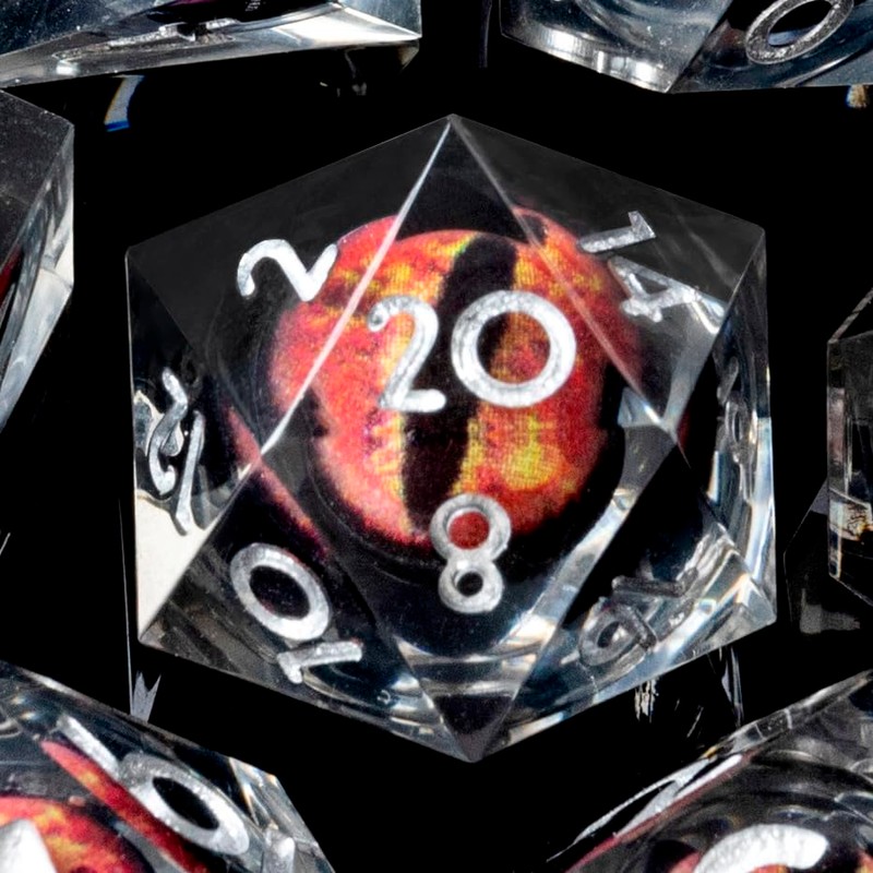 - Dragon Eye Dnd Dice Set:7 Pcs per set, includes D4, D6, D8, D10, D12, D20, and D%. Each sharp resin dice is sanding and polishing by hand to maintain its beautiful sharp edges.