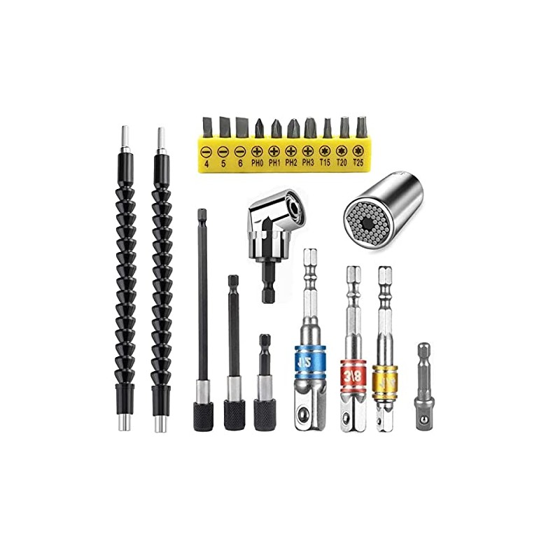 - ⚙What You Will Get: This set includes 2 pcs bendable drill bit extension, 1 pc 105° right angle drill extension, 1 pc 1/4" universal socket adapter, 1 pc 1/2" universal socket adapter, 1 pc 3/8" universal socket adapter, 3 pcs drill bit holders, 10 pcs screwdriver bit set, 1 pc universal socket grip and 1 pc wrench power drill adapter tool. This set can meeting all your needs.