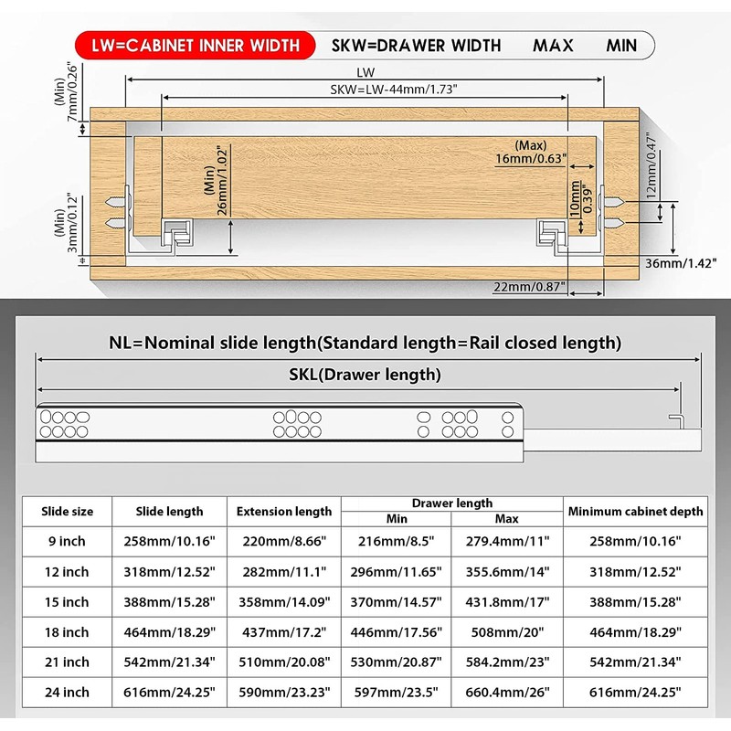 - 【Please Read】Before purchase,It is important to pay attention to the depth of drawers and cabinets. For drawer width: The inside drawer width must equal cabinet opening width minus 44mm(1-3/4") to align and function optimally.Fits for 1/2" and up to 5/8" thickness of drawer side panel; For choosing slides length: Drawer Length: ≥216mm(8.5"); Cabinet Depth Range: ≥258mm(10.16"); please choose 9" slides. For specific parameters, please check the installation drawing on our main photo.