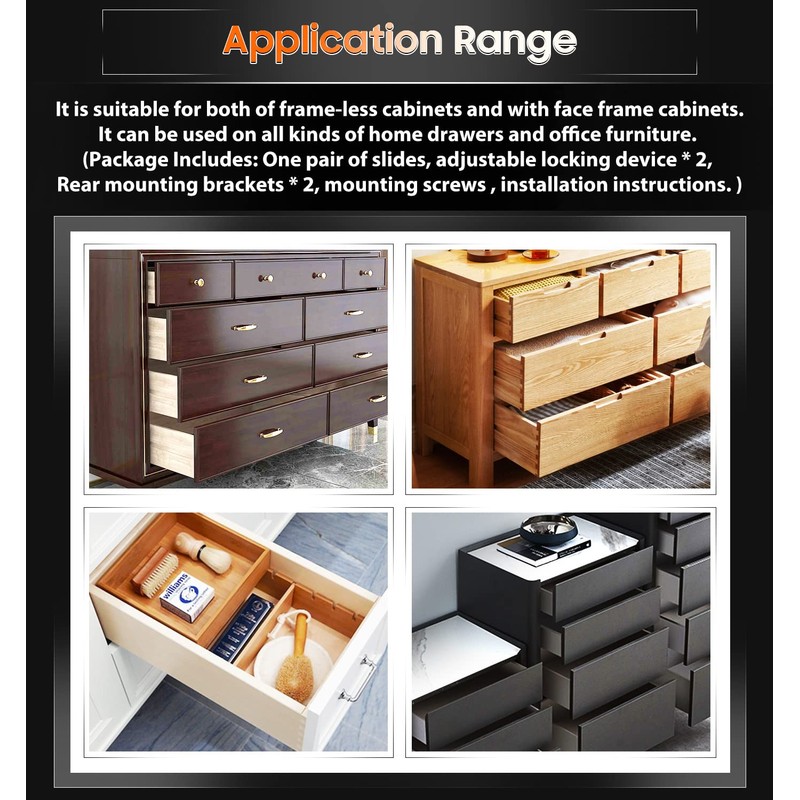 - 【Widely Application】 It is suitable for both of frame-less cabinets and with face frame cabinets ,the rear mounting brackets are included in package. It can be used on all kinds of home drawers and office furniture:cabinet drawers,bathroom drawers ,wardrobe drawers,keyboard drawers,kitchen drawers, etc.