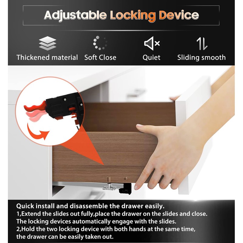 - 【Easy to Install & 3-Fold full extension 】By the adjustable locking device , free to quick install and disassemble the drawer by your will: hold the two locking device with both hands at the same time,the drawer can be easily taken out; “The 3-fold full extension”, enable the slides to fully extend, which allows for the entire drawer's storage to be accessed easily;