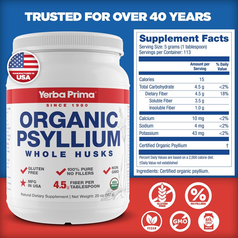 - PLEASE NOTE: World-wide shortage of organic psyllium. DOUBLE CERTIFIED ORGANIC from both the USDA & QAI for quality you can trust. Yerba Prima's Whole Psyllium husk is 100% pure and contains one ingredient: psyllium and nothing else. No rice fillers, No additives, No mag stearate powder. No artificial sweeteners. Check the labels of the competition before buying. Your health deserves premium products.