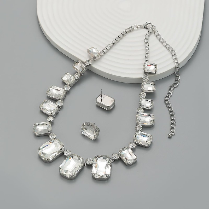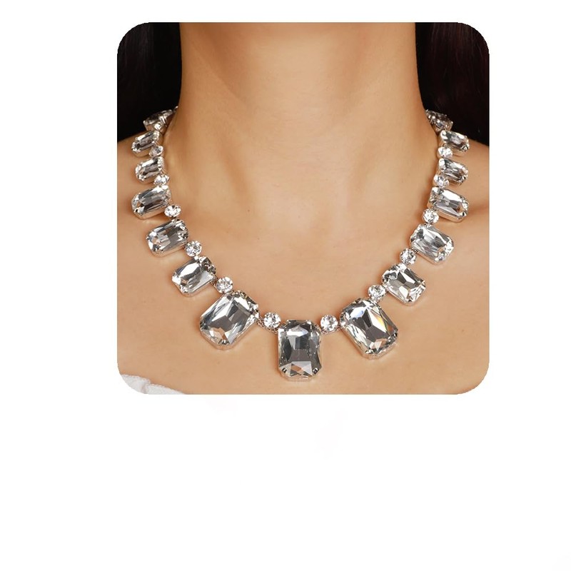 YERTTER Sparkle Full Rhinestone Choker Square Crystal Chain Necklace Earrings Set Crystal Statement Collar Clavicle Choker Necklace for Wedding Women (White)