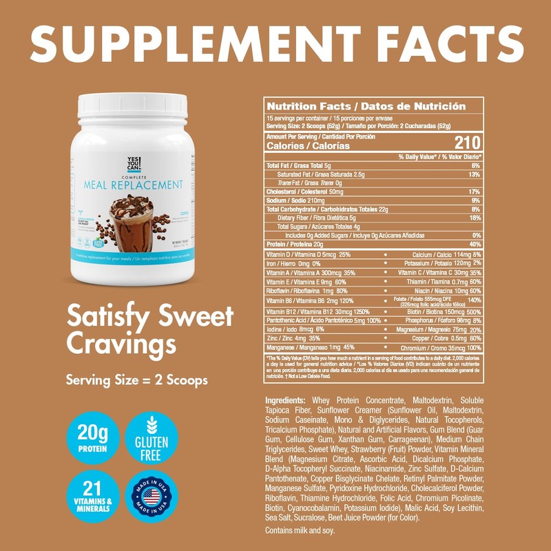 - COMPLETE MEAL ON THE GO: As an all-in-one nutritious meal replacement, Yes You Can! offers you a complete meal on the go. Our replacement shake contains proteins, healthy carbs, fiber, and nutrients. You can bring this shake with you anywhere and enjoy it when hunger strikes whether at the gym, in the office, or in your car.