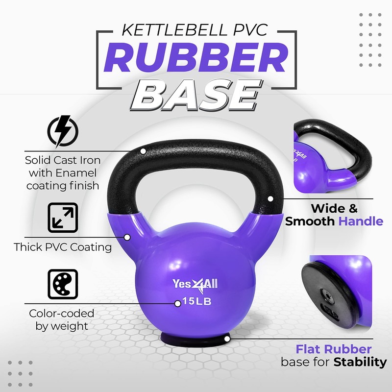 Yes4All Vinyl Coated Kettlebell With Protective Rubber Base, Strength Training Kettlebells for Weightlifting, Conditioning, Strength & Core Training (15 LBS - Violet)