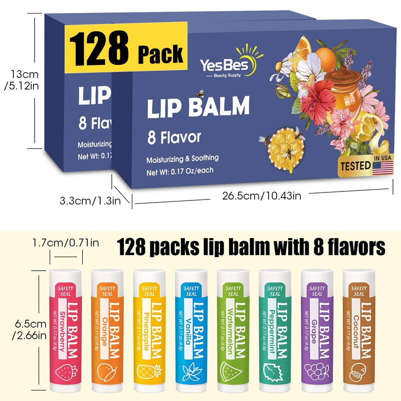 YesBes 128 Pack Lip Balm, Natural Lip Balm Bulk with Vitamin E and Coconut Oil, Moisturizing Lip Balms for Dry Cracked Lips, Lip Balms for Stocking Stuffers - 8 Flavors