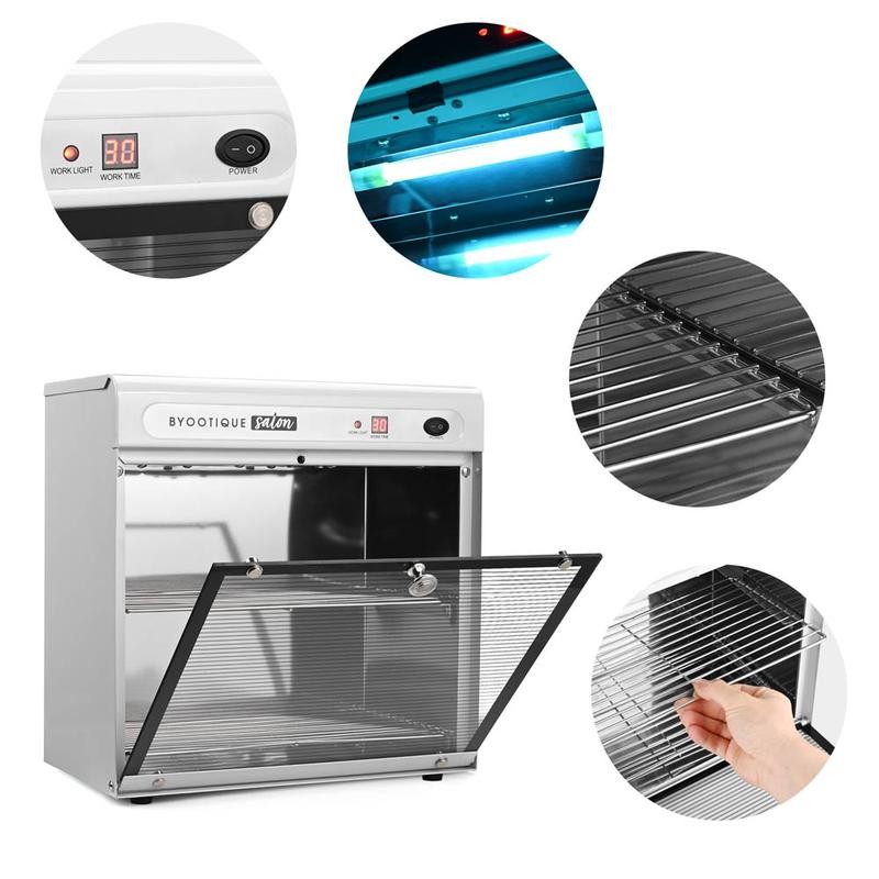 This UV sterilizer is provides complete clean of manicure/pedicure instruments, electrodes, cupping glasses, brushes, sponges, scissors, and all other accessories. It is featured by small occupying space, complete dis low power consumption and stability.