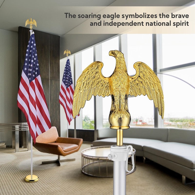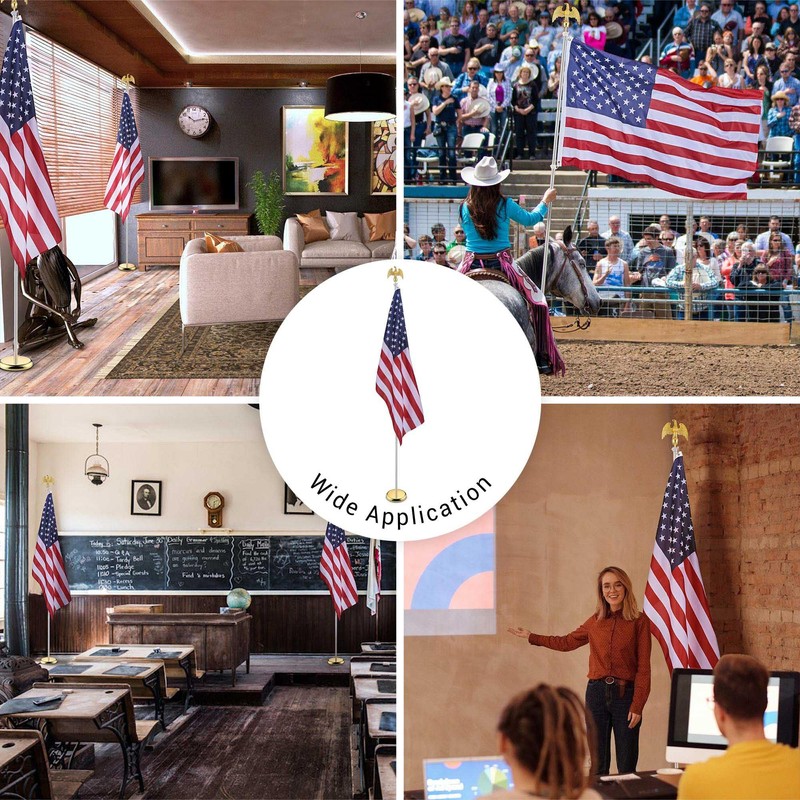 - [2 Pack Flagpole Kits]: Include 2 pcs 8 ft indoor telescopic flag poles, 2 gold eagle finials, 2 American national flags, 2 base stands and accessories, one package for everything you need to display national flag indoors, a perfect decoration for government agencies, institutions, corridor, hallway, office, embassy, school, city hall, church, military ceremony for veterans