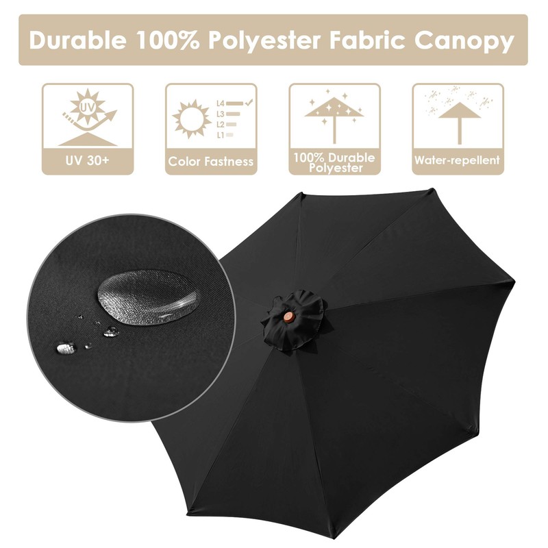 - Wide Application - 9ft umbrella can shade 38" to 48" round table or square table which is up to 48" long; for patio, garden, pool side, villa, hotel and café Specifications: - Overall Dimension(Dia.xH): 108" x 94 1/2" (274.32 x 240 cm)