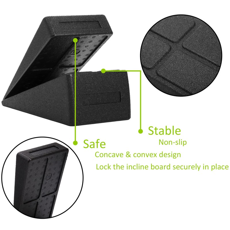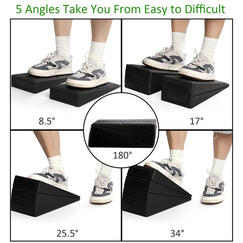 - 5 adjustable incline settings. The blocks stack easily and hold together when doing stretching and exercises. You can use 5 different angles( 8.5°, 17°, 25.5°, 34° and 180°) for physical therapy on your needs. Makes sure to always wear socks to provide better grip.