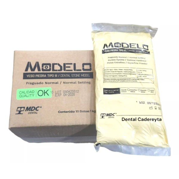 Yeso Piedra Tipo 3 Modelo Amarillo Dental MDC 10 Kilos es un material de alta calidad diseñado específicamente para la odontología. Su formulación especial permite obtener modelos dentales con un alto grado de precisión y detalle, esenciales para la fabricación de prótesis, coronas, puentes y otros trabajos odontológicos. Este yeso es fácil de mezclar y manejar, ofreciendo una excelente resistencia y durabilidad una vez fraguado.