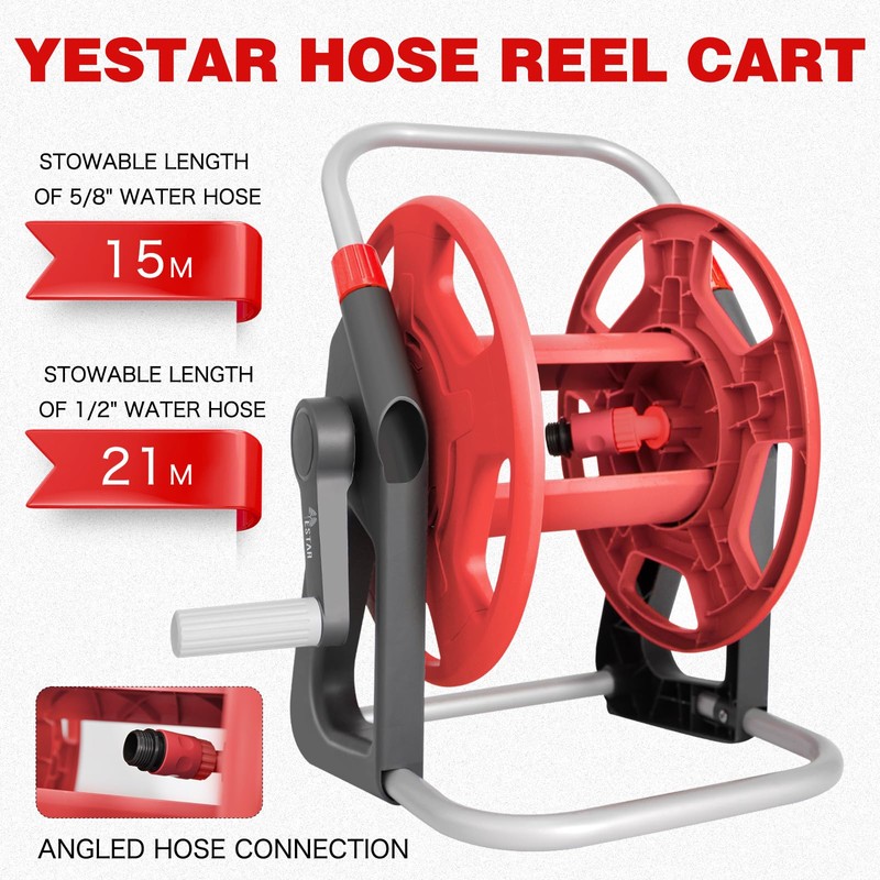Yestar telescopic metal hose cart Store up to 21(1/2") or15m(5/8") hose Height-adjustable handle can adapt to the user's height Angled hose connection prevents hose from wrapping,kinking or twisting while winding on and off Rust and corrosion resistance.