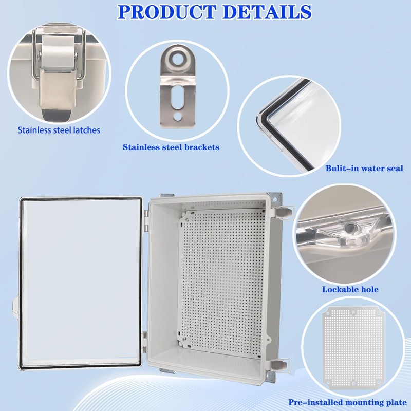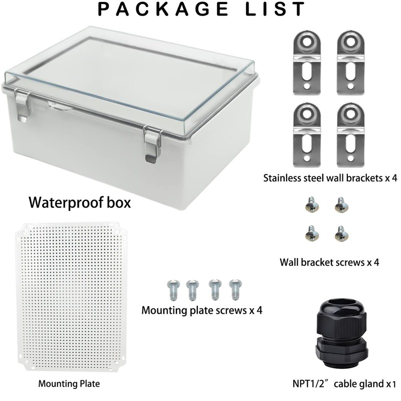 • [Easy to Customize and Install]:The outdoor waterproof electrical box includes mounting plate that allow you to mount your board or device in the project box easily. Also come with 4 stainless steel wall brackets can be used to hang the junction box on walls.when you need to connect wires you can use 1/2" NPT cable glands are included .This junction box can be drilled and shaped easily without cracking,helping you customize any projects effortlessly.