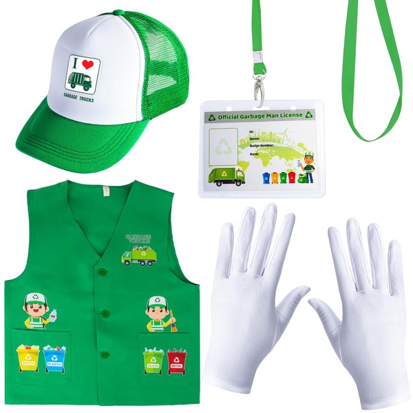 - Waste Management Costume: You will receive 4 pieces kids garbage man costume accessories including 1 garbage truck vest, 1 recycle logo tucker cap, 1 pair costume gloves and 1 waste management man ID license, provide you with a party that full of trash trucks theme atmosphere
