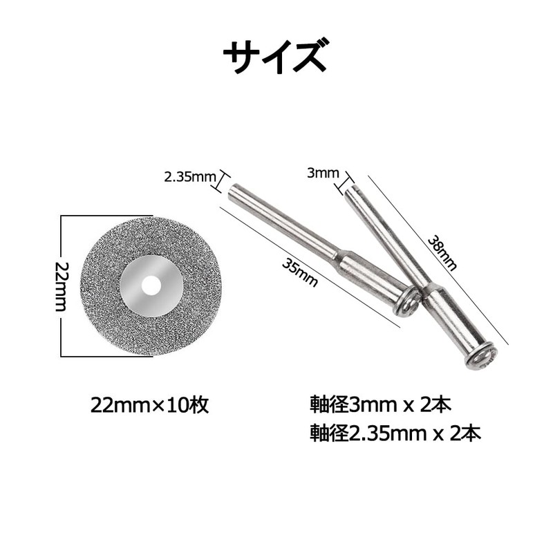- (Size) Diamond cutter: Diameter 0.9 inch (22 mm), Thickness 0.02 inch (0.6 mm), Shaft diameter: 0.09 inch (2.35 mm), Length 1.4 inch (35 mm), Diameter 0.1 inch (3.00 mm), Length 1.5 inch (38 mm). *Size may vary slightly, but will not affect use