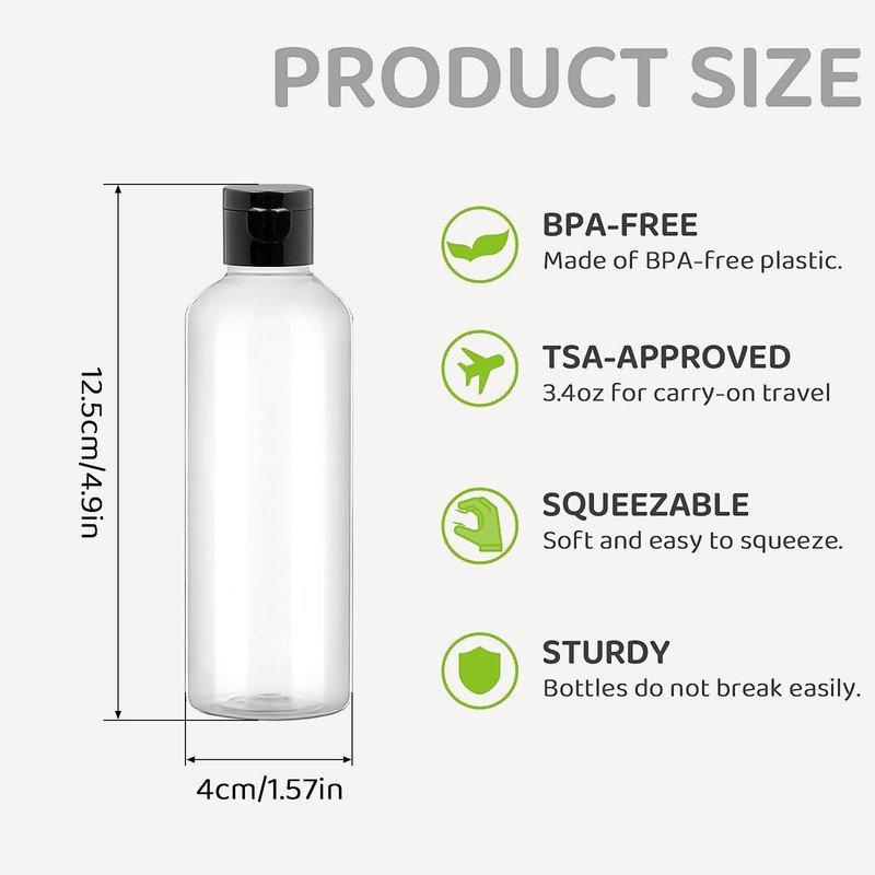 - Hochwertiges Material: Diese Reisebehälter für Flüssigkeiten bestehen aus hochwertigem Kunststoff, sind leicht, BPA-frei, transparent, schlagfest und bruchsicher. Die 100 ml Reiseflaschen sind eine sichere und praktische Alternative zu Glasflaschen und eignen sich ideal für den täglichen Gebrauch unterwegs oder im Handgepäck.