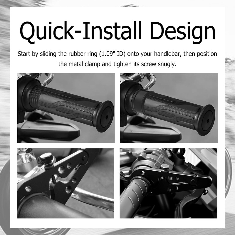 - Quick-Install Design: Start by sliding the rubber ring (1.09" ID) onto your handlebar, then position the metal clamp and tighten its screw snugly. For the throttle assist, either clip it onto existing grips or slide it inward from the handlebar end. Both parts install without tools