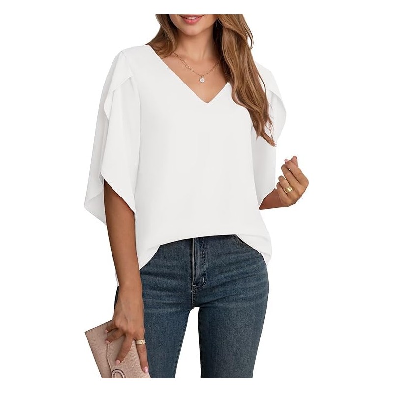 - Features:This loose fit chiffon blouses summer top,no ironing required,after washed and hung to dry can get rid of the wrinkles.V-neck,Half ruffle split 3/4 sleeve, Lightweight,flowy,and soft chiffon material,flowy,no see through,no shrink