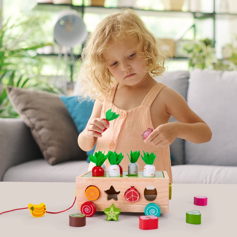 - Montessori 6 in 1 toy: grow and harvest carrots; children can pull or push it on trucks on the rope and four wheels; the cube wooden box toy can easily store all the parts; and baby can recognize shape, fruit and colour.