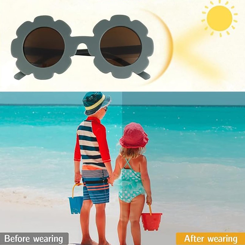 - 【Unique Design】The sunglasses are designed with cute round and flower shapes, your children will be more cute and attractive when wearing these sunglasses. sunglasses lenses can block 100% of UVA and UVB radiation, effectively reduce the damage of ultraviolet rays and protect your children's eyes. These cute sunglasses are the perfect party accessory.