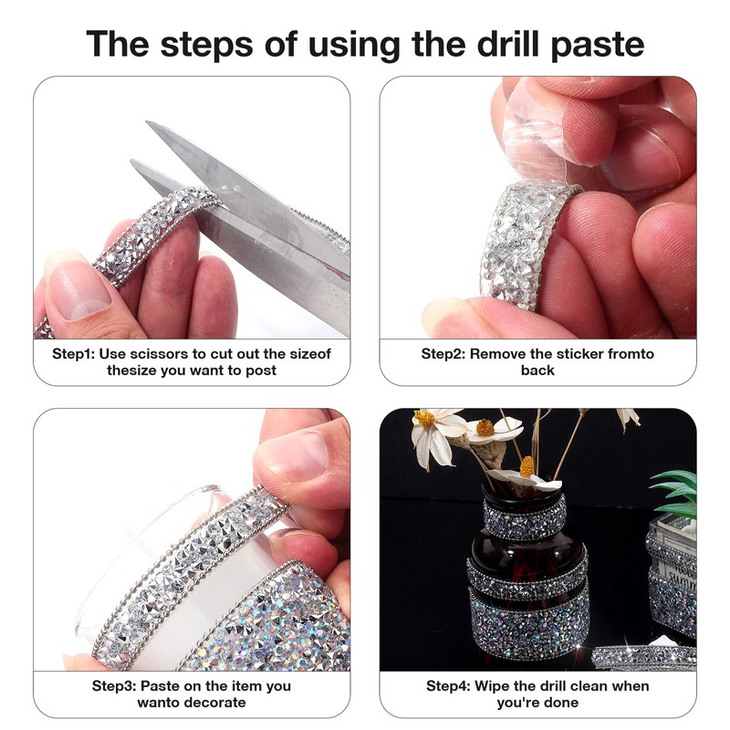 - Self Adhesive Diamond Tape The self adhesive design with backing adhesive allows it to be stuck anywhere as long as the surface is smooth and clean. You cut the rhinestone ribbon into different lengths with scissors, then peel off the backing paper of the sticker and stick it to the project you want to decorate.