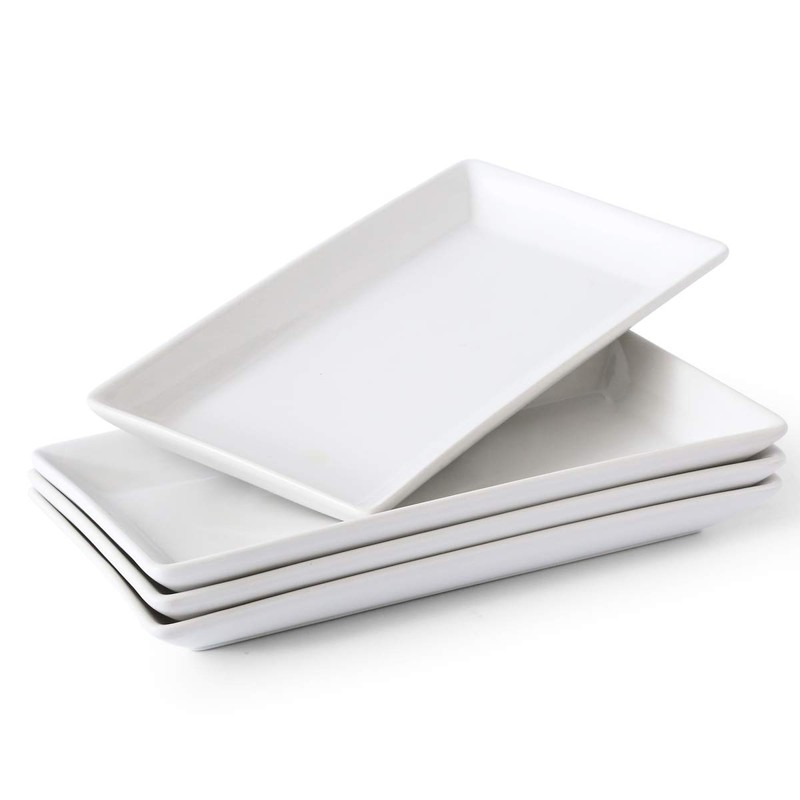 - Perfect Size to Server: A set of 4 serving platter(12 x 6.25 x 1.25 inch) is large enough for hold a variety of food, sushi, deli meats, raw veggies,cupcakes,taco,cheese and dessert, snack,appetizers.The white ceramic plate set also can also be used for any occasions:family dinner,wedding,birthday, party or daily use.