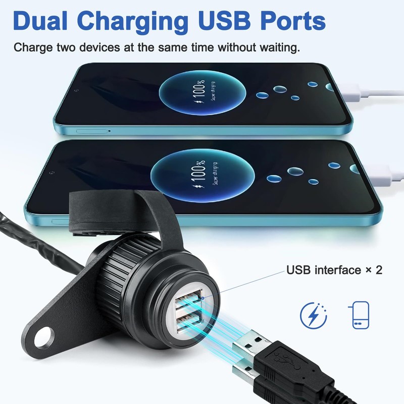 - 【Dual Charging USB Ports】The motorcycle USB charger is equipped withdual 5V/2A output ports ports, so you can charge two devices at the same time without waiting. Compatible with both the USB adaptor and smartphone holder. A socket suitable for charging electronic devices such as any phone, Tablet, GPS, camera, etc.